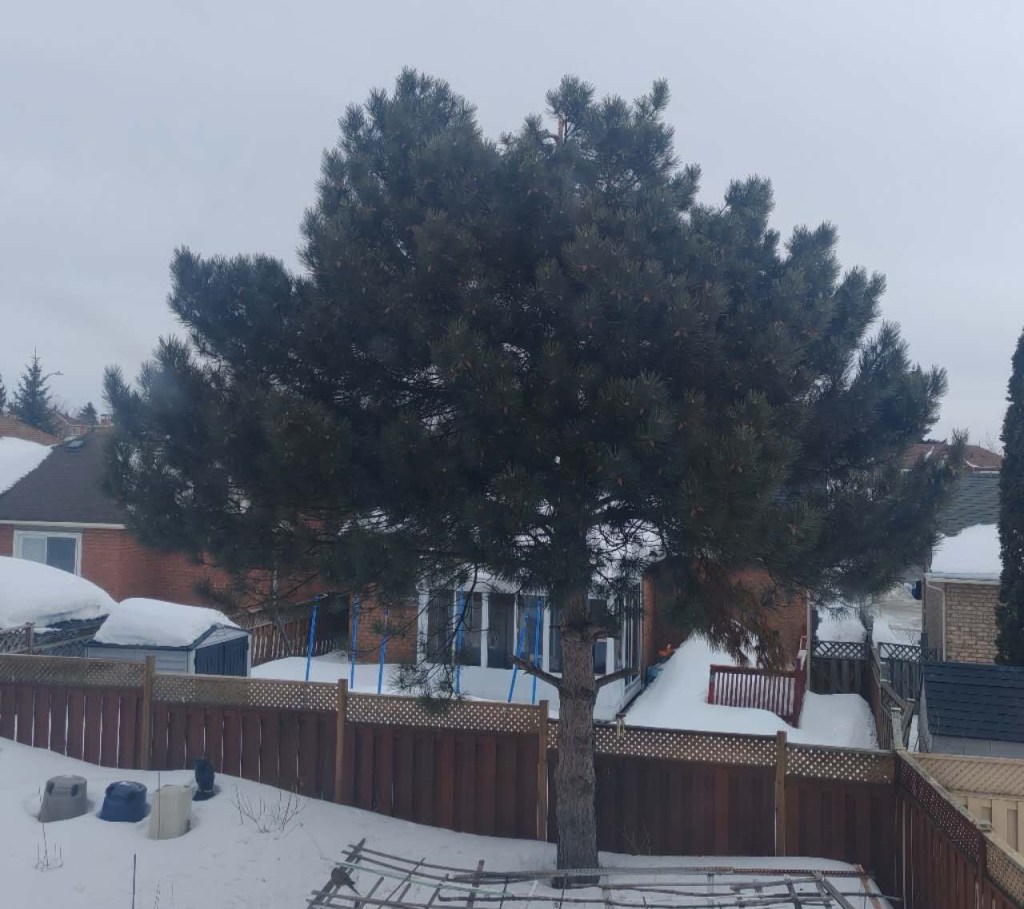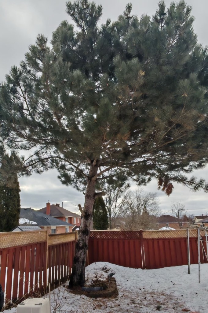 This pine tree was about 20 inches DBH and leaning toward the house, with a fence close by. Because of the lean, we had to fell it against the natural lean, which required careful planning.